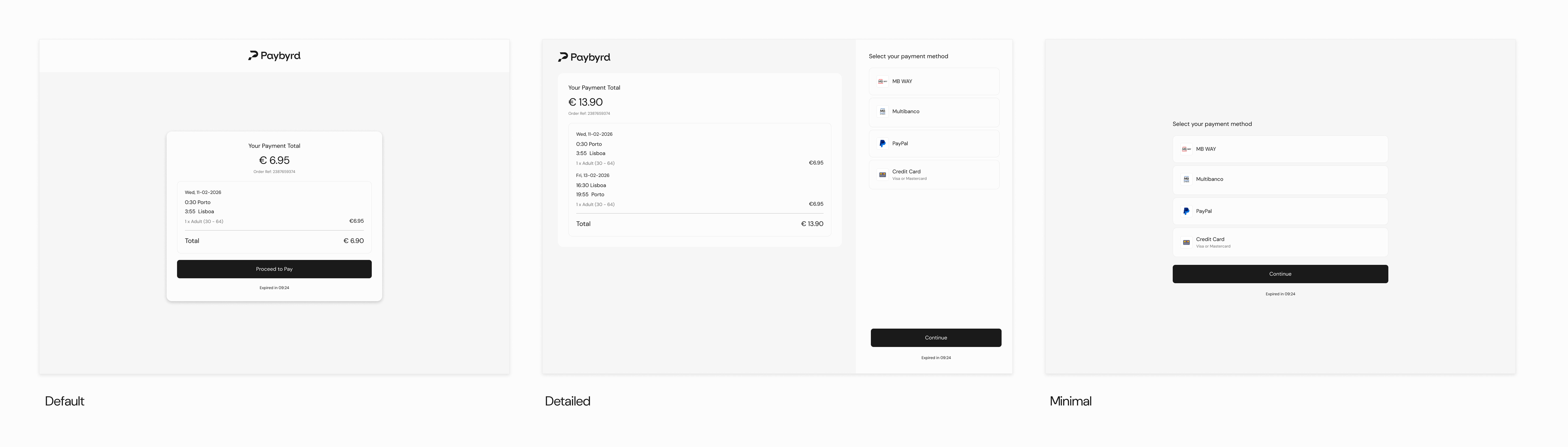 default,detailed, andminimaldefaultis similar to the previous version.detailedshows a clear overview of the payment details and the available payment methods all within one screen.minimalis recommended for using in iframes. It focuses on only displaying sections that the user can interact with.- You can set the display variant by adding a pathname property to the checkout URL. For example: